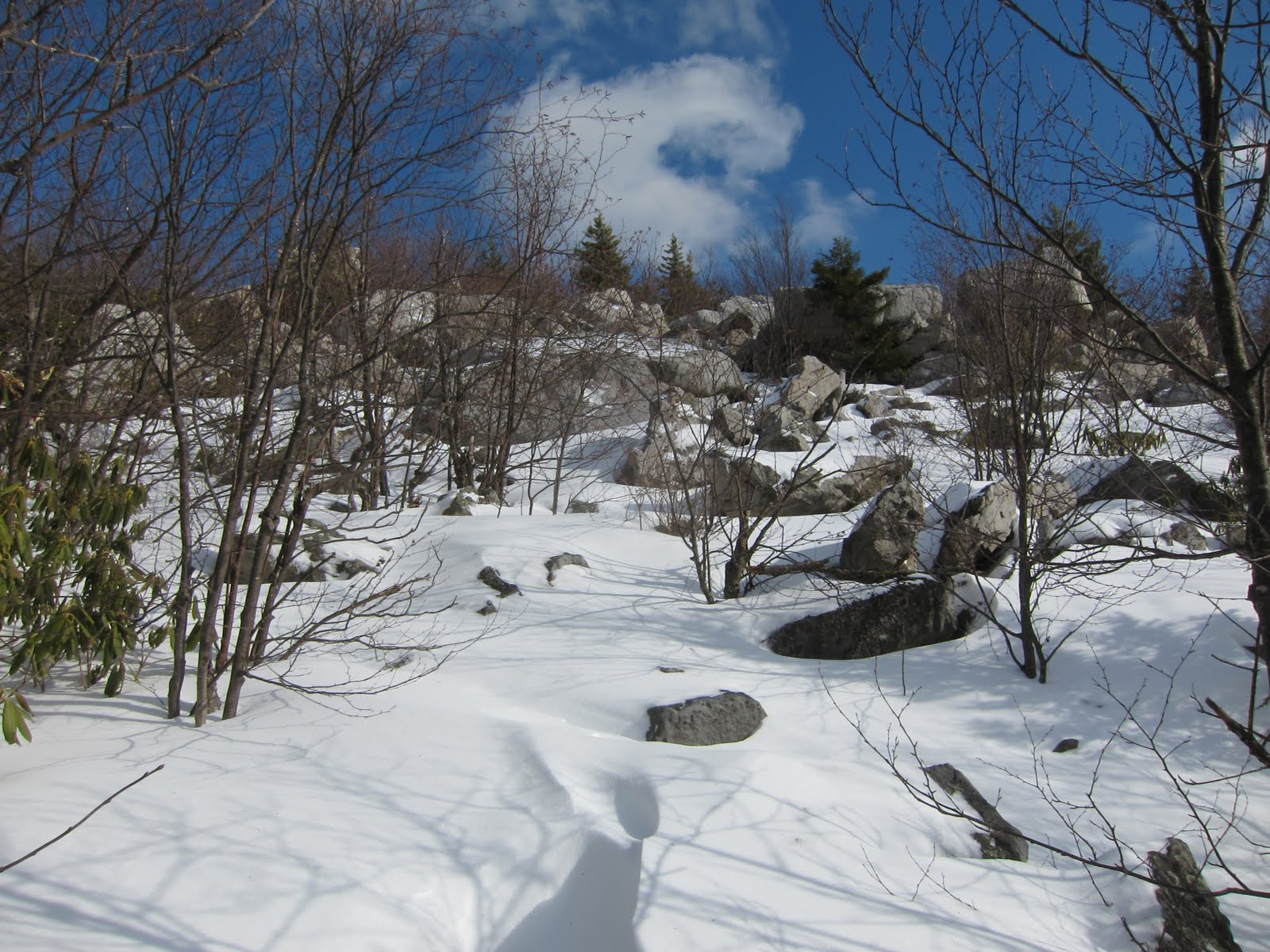 I slept well on the mattress, pad that I brought and provided wool blanket. We all got up at generally the same time. I was the first out of bed, and very ungracefully slid off the top bunk. We got up and moving and I made a fire as Steve and Jim got some more wood. Jim, grabbing the huge, and largely ineffectual splitting axe. After I got the fire going with some of Jim's fire starter, I put the perkalator on the stove - I eventually got tired of waiting for the stove and used Steve's stove outside to get it perking. After eating our breakfasts we looked at the map and decided to go to Half Moon Mountain as a day hike with our small packs. We tossed lunches and water and some other layers of clothing into our day packs and set off up the trail. At the intersection of the Tuscarora, we turned onto that and followed the trail around to another intersection. On the next part we started seeing bear tracks - first one set on the trail going one way, then another pair and a third set. We pondered aloud if it was the same bear going in circles or a series of them - some pairs looked smaller or larger. It was really cool to be in the snow and see the tracks - with no snow we would have no evidence of an animal that large wandering around (well, except some scat).